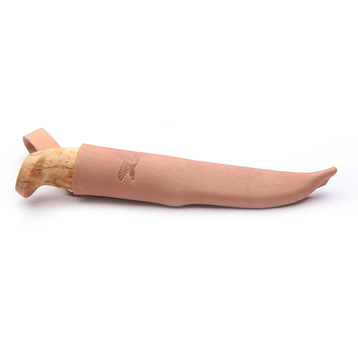 This is an attractive package featuring a wide, solid carbon steel blade attached to a hefty handle. The short, solid blade is ideal for gutting small to medium-sized game. The full-length tang is evident by the brass nut on the pommel, giving this knife added durability. The handle is made from curly birch wood, sanded, stained, and polished to a smooth finish, and has both an inset for your index finger, and a hooked pommel so the knife will never slip out of your hand. The handle also has the image of a duck in flight burned into it. The blade is lightly inscribed with the Iisakki Järvenpää signature. When you hold this knife in your hand, you can feel the solid construction and high quality.