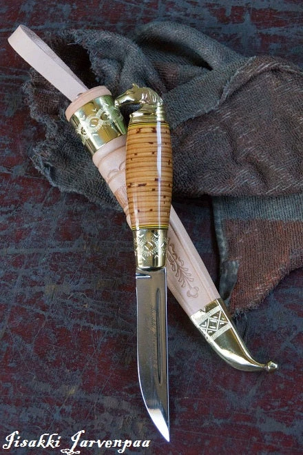 The Lappland Puukko is the traditional utility knife of the Sami people. Its design has evolved over the centuries into one of the most versatile and functional knives in existence today. This is a solid all-around camp or utility knife, featuring a long, medium-width stainless steel blade lightly inscribed with the Iisakki Järvenpää signature. This is a puukko knife with a pommel cast into a miniature horse’s head, which is a very traditional Scandinavian design. The handle is made from stacked layers of birch bark, lacquered and polished smooth.