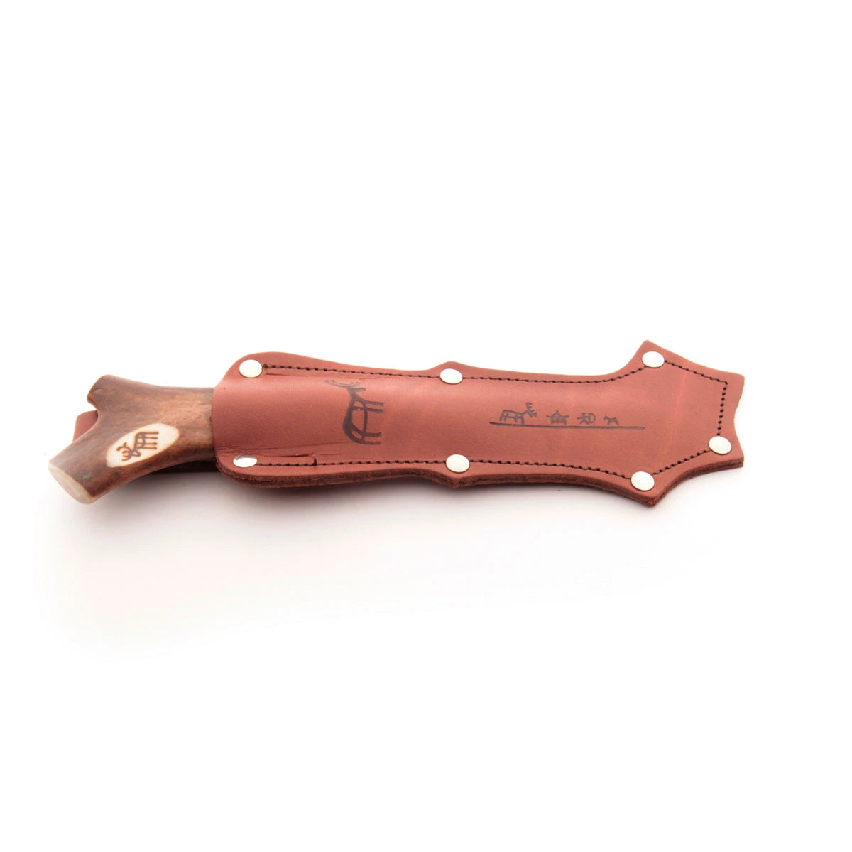 This is the “big brother” to the Reindeer 60, with a larger blade, more substantial handle, and rivets to reinforce the stitching on the sheath. The sheath is stamped with a hunting scene and the handle is carved with hunting figures. There will be variation between the item picture and the exact shape and engravings on the handle. This makes every piece a little unique. NOTE: the item pictured has engraving along the blade, but the knives that we have in-hand do not have this engraving.