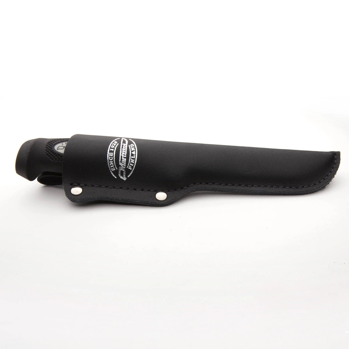 Comes with a nicely constructed leather sheath featuring the Marttiini logo printed in silvery ink, and it contains a plastic liner to prevent the very sharp blade from slicing through.