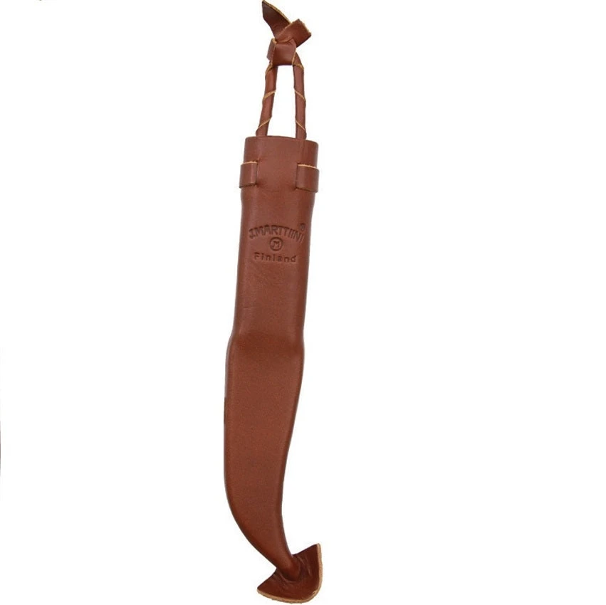 The blackened blade features an embossed Marttiini signature, and the handle is bare wood, lightly stained with tar, with both a hooked pommel ad a finger inset to give you a better grip. The stamped leather sheath is a traditional scandinavian deep pouch style, stitched up the back, and has a twisted leather cord to securely attach it to your belt while allowing more flexibility of movement than a more rigid belt loop. The sheath also has a partial insert at the bottom, to protect both the sheath and the hand from the blade slicing through if inserted incorectly.