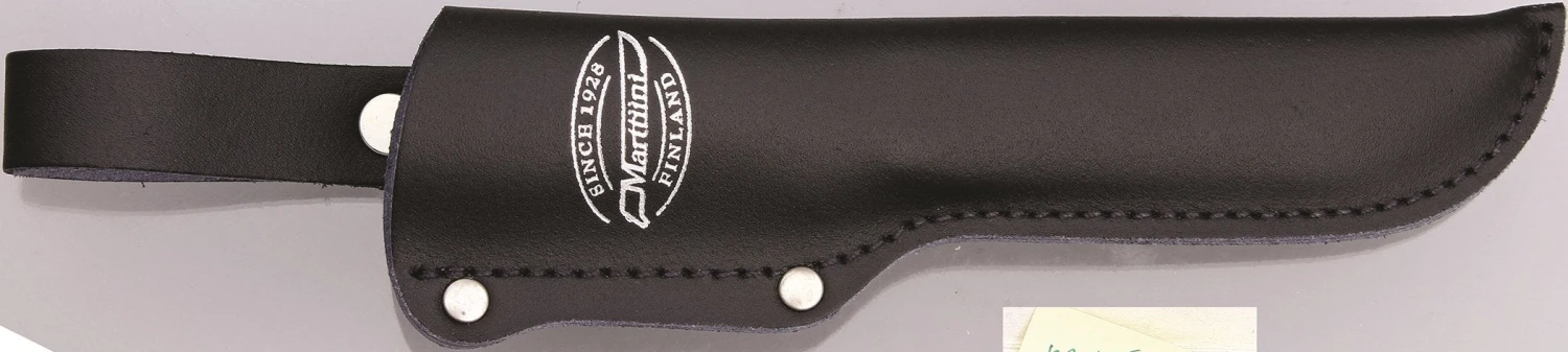 Comes with a nicely constructed leather sheath featuring the Marttiini logo printed in silvery ink. The sheath contains a plastic liner to prevent the very sharp blade from slicing through, and the belt loop is attached by a metal D-ring so that it swings freely and keeps out of the way when you’re crouching or sitting.