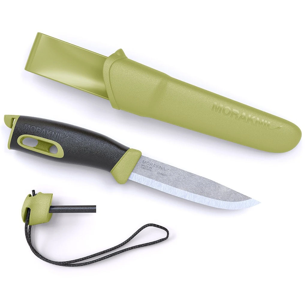 This is a nicely enhanced version of Mora’s mainstay Companion knife. It features a rubberized coating on the handle, and a fire steel which detaches from the pommel, so you can always start a fire without bringing a separate fire starter. The back of the blade is sharply squared off for using the fire steel, which is made from the same material used in Mora’s bushcraft survival knife, and which produces a nice heavy shower of sparks. The knife firmly click-locks into the sheath, and the sheath features both a sturdy belt clip as well as a hole on the end for drainage. This is a great, compact and completely useful package that you should never enter the woods without.
