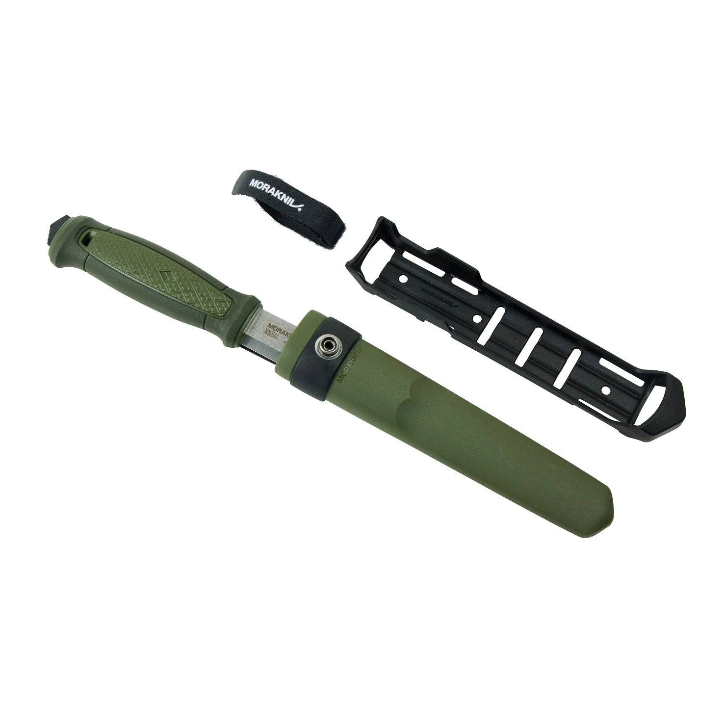The Kansbol uses the same blade as the Mora 2000, which gets thinner as it approaches the tip to facilitate easier skinning, along with the handle from the Garberg, which is symmetrical and thus can be held with with the blade edge facing up or down. The knife click-locks firmly into the plastic sheath. This version comes with a “multi-mount” sheath, which according to Mora: “The range of mounting options is endless, thanks to its Velcro strips, straps, holes, and notches. And of course, it is MOLLE compatible.”