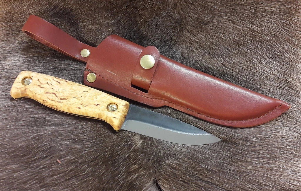 This is a very solid and durable full-tang bushcraft knife. The wide handle is made from hefty pieces of curly birch wood with attractive figuring. The tough, sharp carbon steel blade is a full inch wide and a hefty 1/8 inch thick, which is the perfect balance of strength and weight. The leather sheath has a snap-lock to keep the knife securely in place, a plastic liner to prevent it from slicing through, and a belt loop attached by a metal ring, to allow the knife to swiing freely and not get in the way while crouching or sitting.